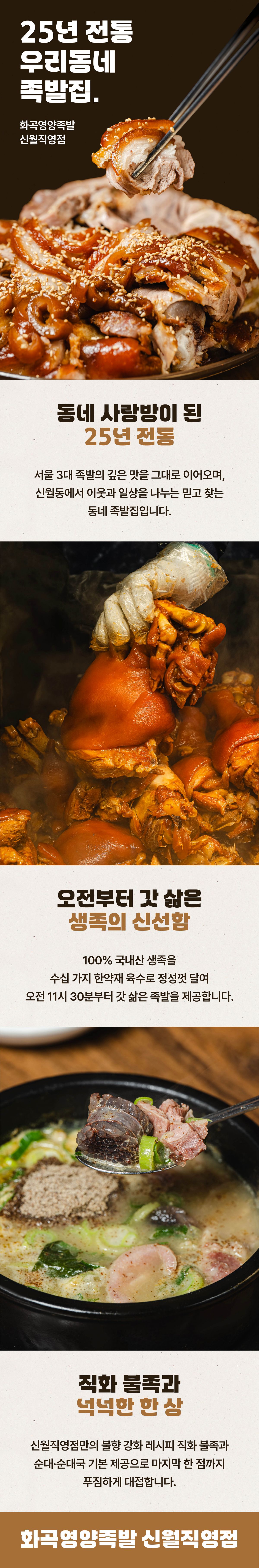 '언제든 믿고 먹는 집'이라는 신뢰를 최고의 가치로 여기며, 25년 숙련된 맛과 변함없는 미소로 늘 한결같이 이 자리를 지키는 화곡역맛집 화곡영양족발 신월직영점입니다.